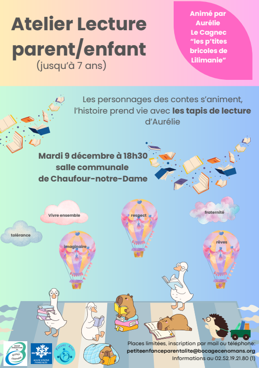 Le Bocage Cénomans vous invite à un atelier lecture chaleureux et ludique, ouvert aux parents et aux enfants jusqu’à 7 ans !