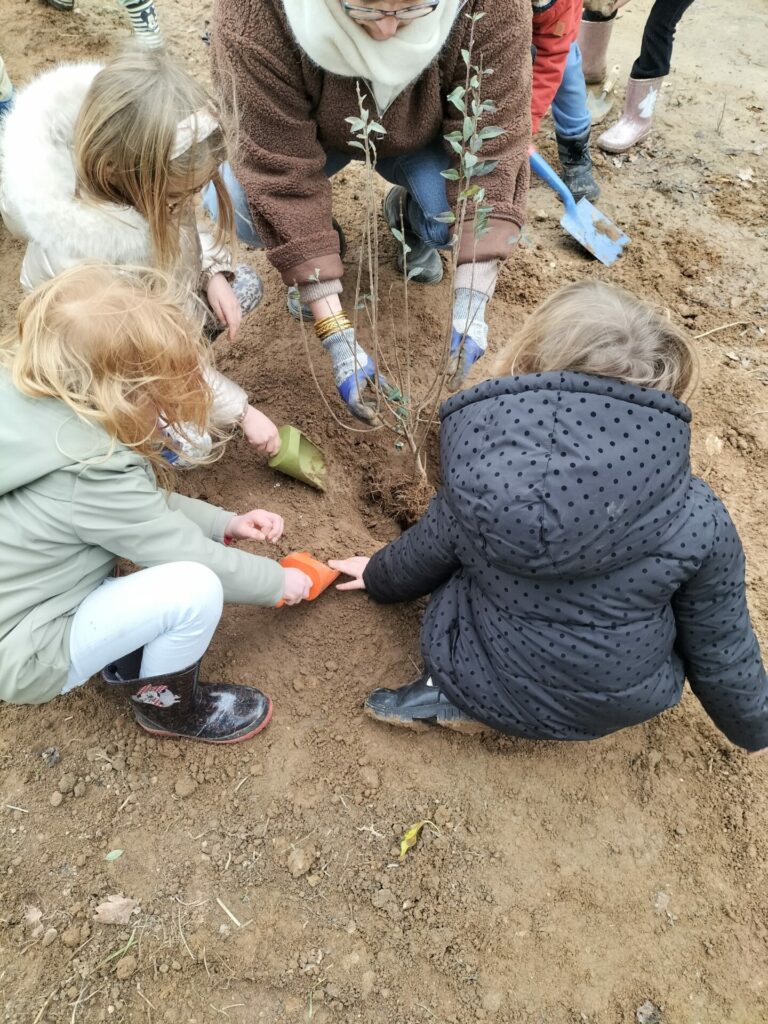 Les enfants ont pu procéder à toutes les étapes de plantation, faire le trou en fonction de l’importance du plant, praliner les racines pour favoriser la bonne reprise, reboucher le trou et tasser la terre, mettre un filet de protection ou « chaussette ». La journée fut bien remplie et malgré la température fraiche les cœurs des enfants étaient chauds et contents d’avoir passé un bon moment à « patouiller » ensemble.